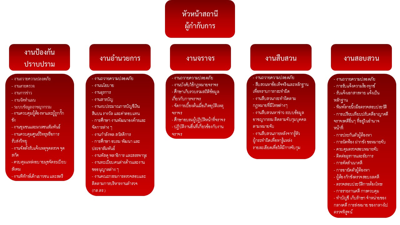 • รองผู้กำกับการป้องกันปราบ เป็นหัวหน้างานป้องกันปราบปาม งานจราจร และงานอำนวยการ