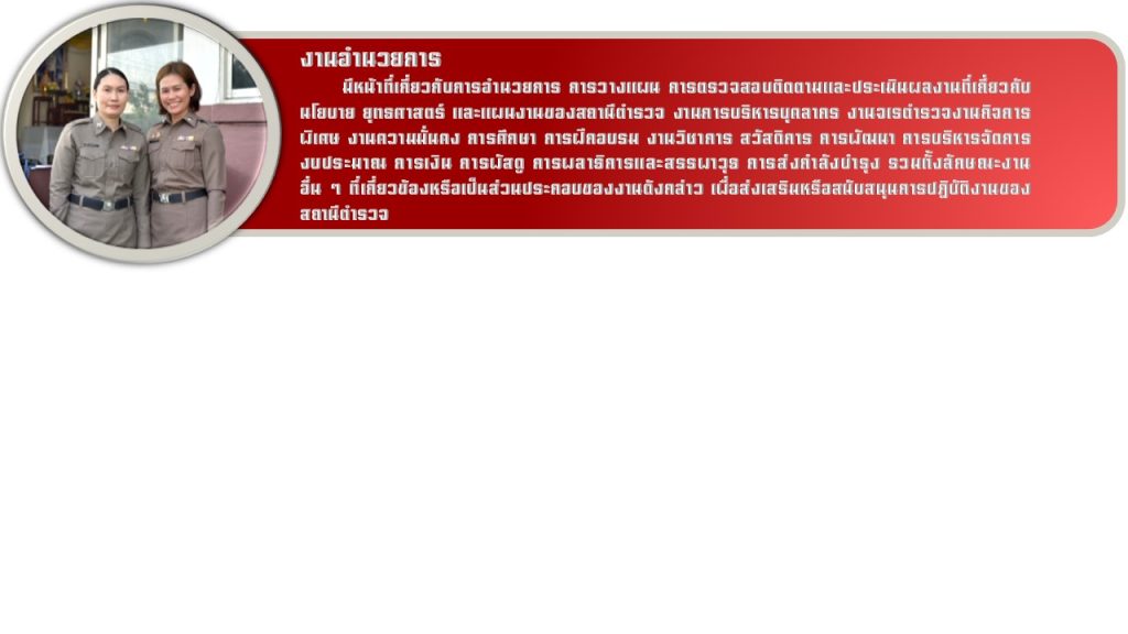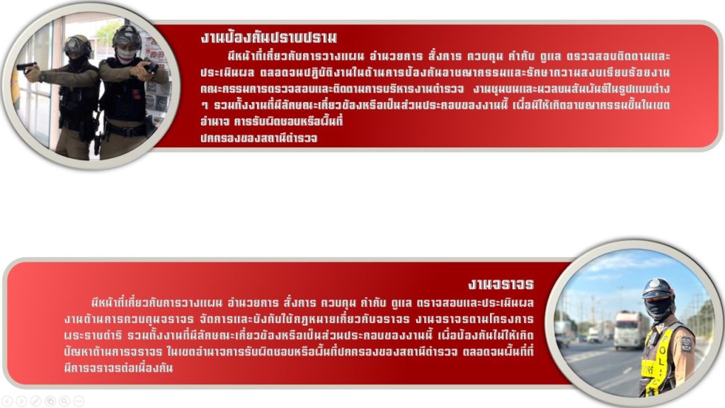 • รองผู้กำกับการป้องกันปราบ เป็นหัวหน้างานป้องกันปราบปาม งานจราจร และงานอำนวยการ
